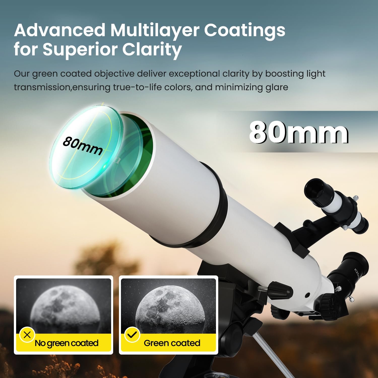 • 【Premium Quality Optics】Fully coated lenses with low reflection loss and high light transmission creates stunning images. 70mm aperture provides excellent light gathering power and a wide field of view. Perfect telescope for kids and astronomy beginners to explore the Moon and other planets.