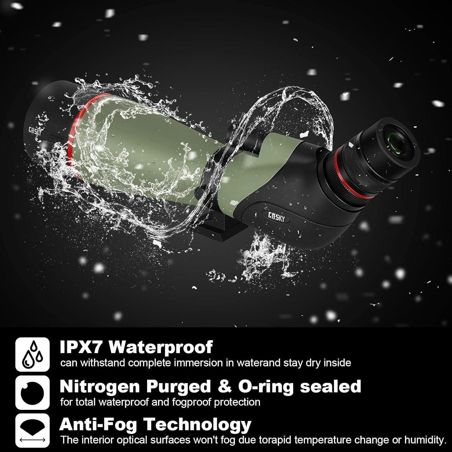 - 【Waterproof, Fog-proof & Weatherproof】The spotting scope is nitrogen purged and O-Ring sealed to prevent damage from moisture, dust and debris in harsh environment. Durable magnalium framework with rubber armor provide non-slip grip and external protection from shock. The eyepiece shield can be stretched out to protect the eyepiece, completely protection for all weather conditions. Make it extra-rugged for shooting range outings and wild adventures.