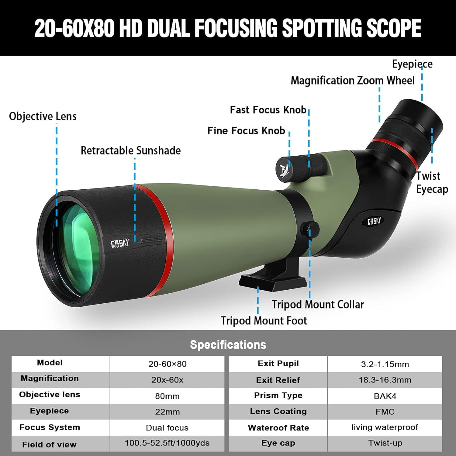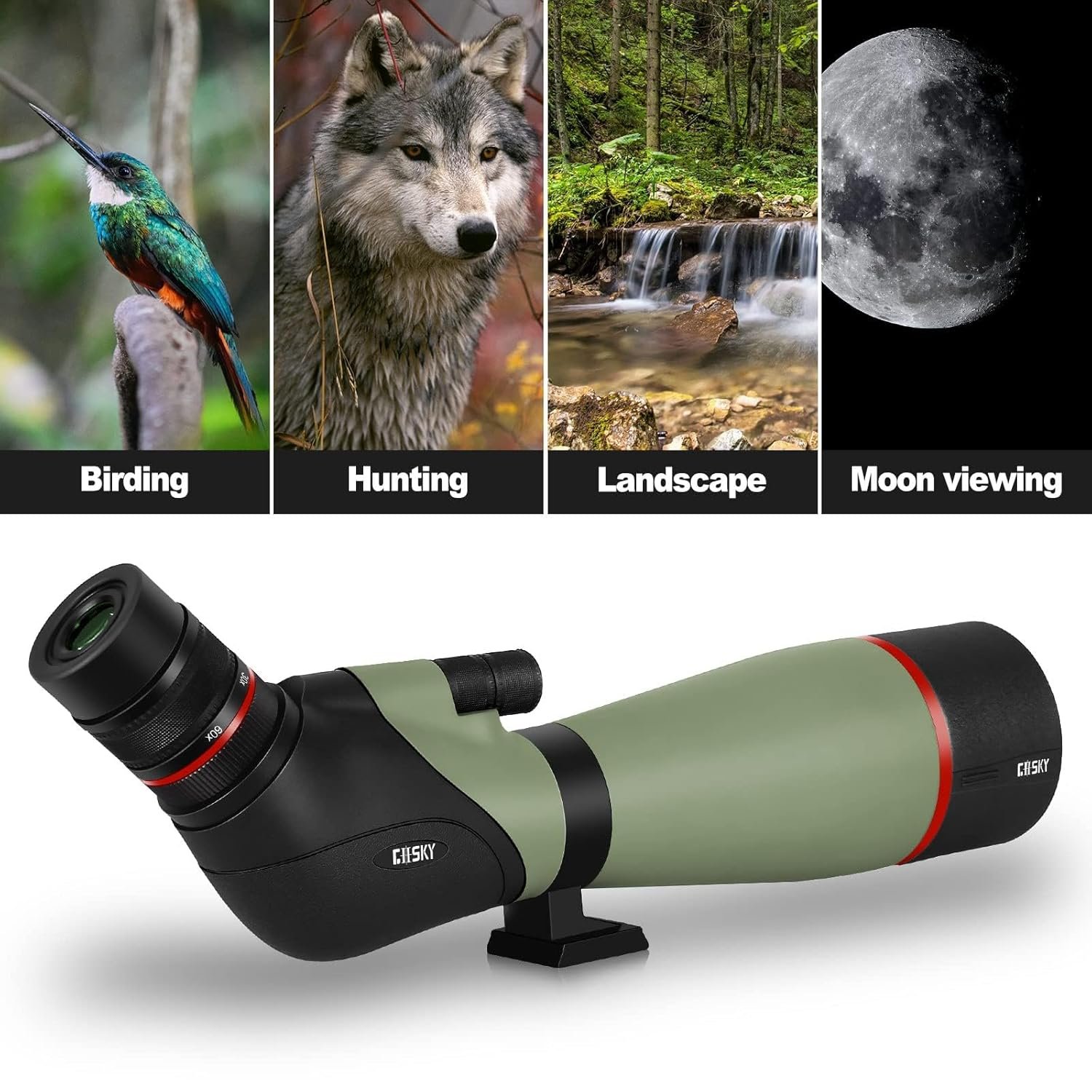 - 【High Magnification】The spotting scope offers powerful variable zoom magnification 20X-60X, 45 degree angled eyepiece ergonomic design allows more comfortable viewing. Field-of-view is 100.5-52.5ft/1000yds, help you see targets from long range. Perfect for target shooting, hunting, bird watching wildlife, spotting moon, traveling, hiking, camping, archery etc