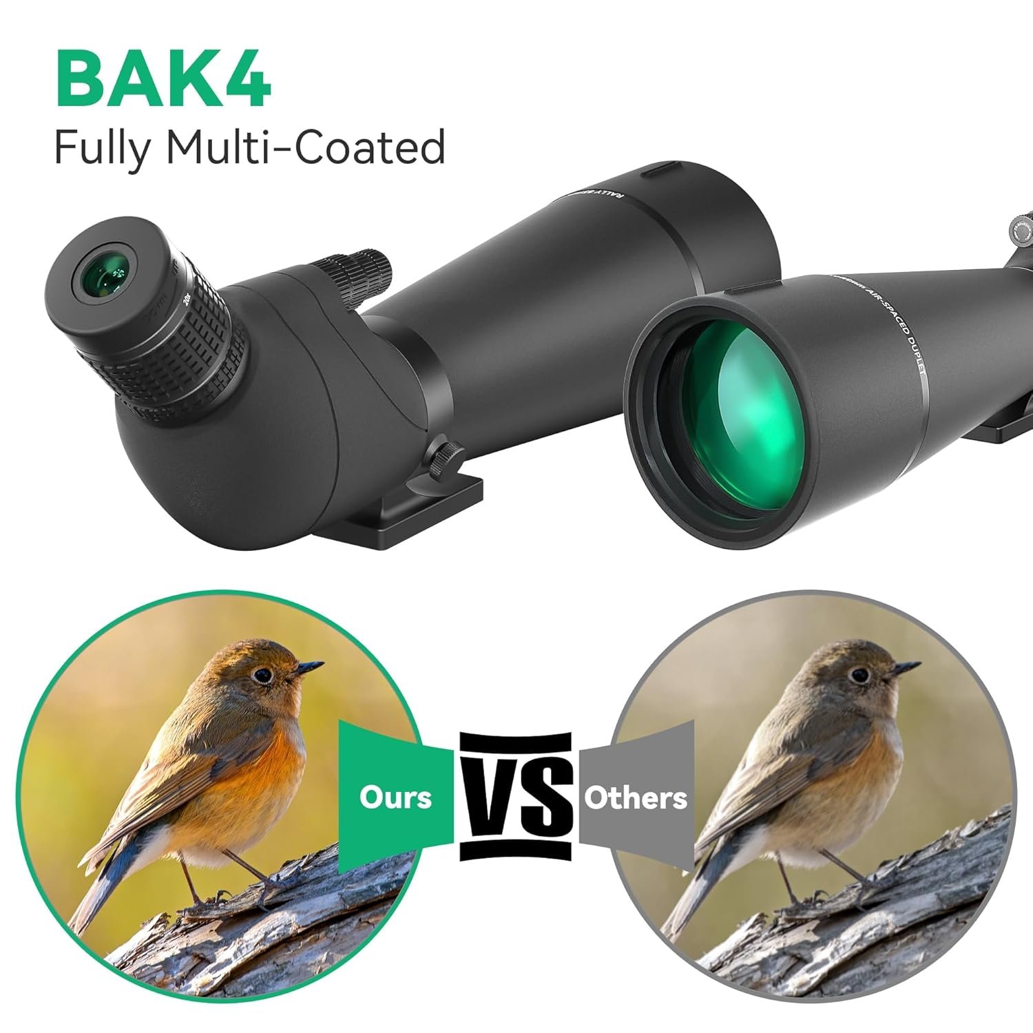 • Fully multi-coated 80mm green film objective lens provides a field of view at 82.9-48ft/1000yards. The quality BAK4 Porro prism optics increases light transmission and make your view brighter, clearer and delivers crisp images