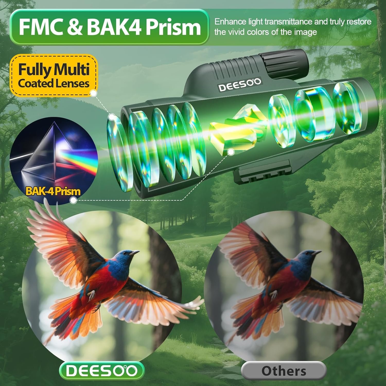 - Excellent Optical Components: Adopting fully multi-coated (FMC) lenses and BAK4 prisms, the light transmittance is up to 98%, the color reproduction is true, and the image is sharp and glare-free. ED extra-low dispersion glass effectively reduces chromatic aberration and the edge image is distortion-free. It can also be used in low-light environments.