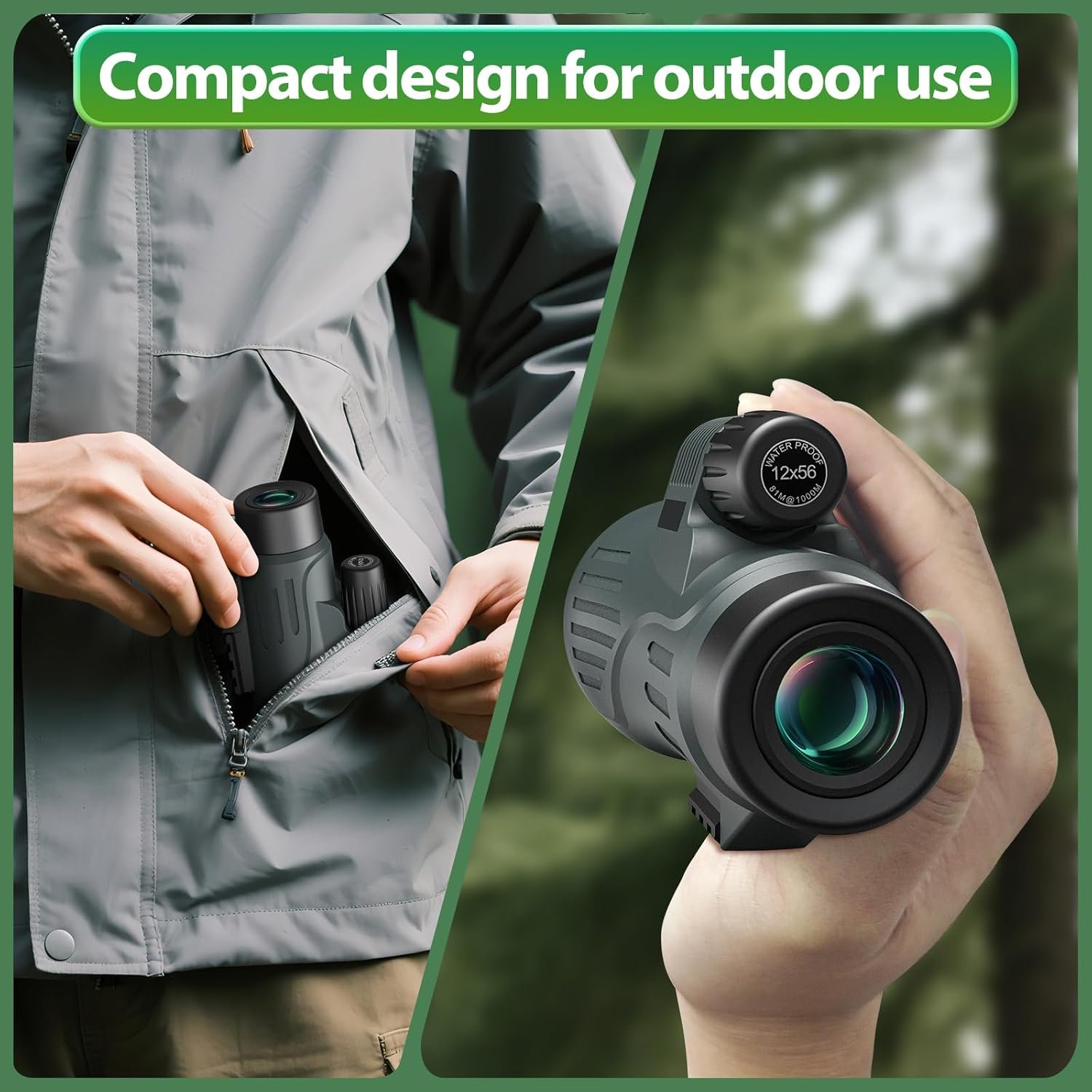 - Lightweight & Portable Design: The compact body weighs only 1.65lb and can be easily put into the side pocket of a backpack. The thumb groove and anti-slip texture design allow you to quickly raise it to capture the target when hiking, hunting or camping. The IPX7 waterproof and fog-proof design adapts to harsh environments such as rain, snow, and the seaside, and long-distance outdoor adventures are no longer a burden.