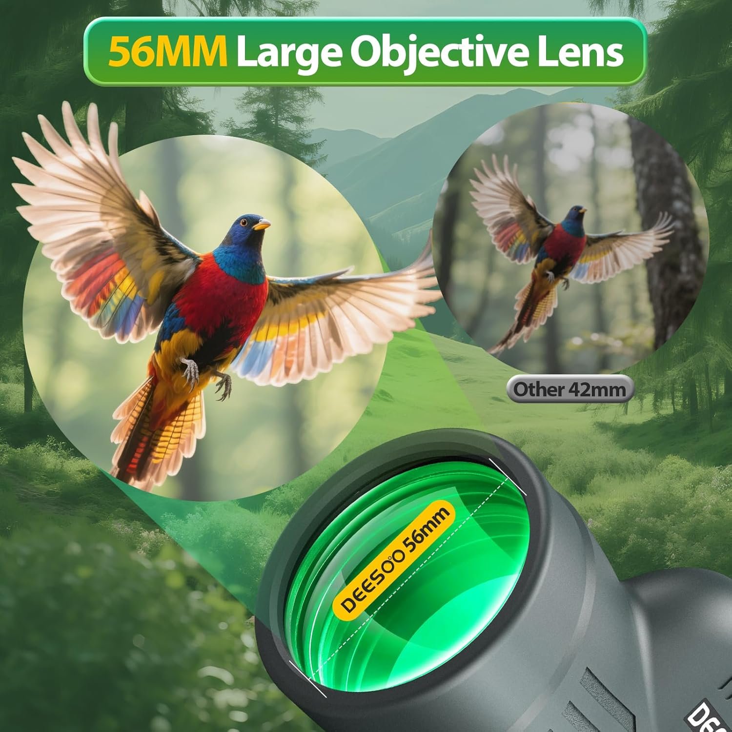 - Crystal Clear Vision: Deesoo 12×56 binoculars provide 12x high magnification, easily capturing distant details, and the 56mm super-large objective lens allows 2.5 times more light than ordinary 42mm lenses, presenting bright and clear images even at dawn, dusk or moonlight. Ideal for bird watching, hunting and astronomical observation.